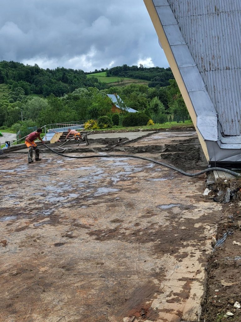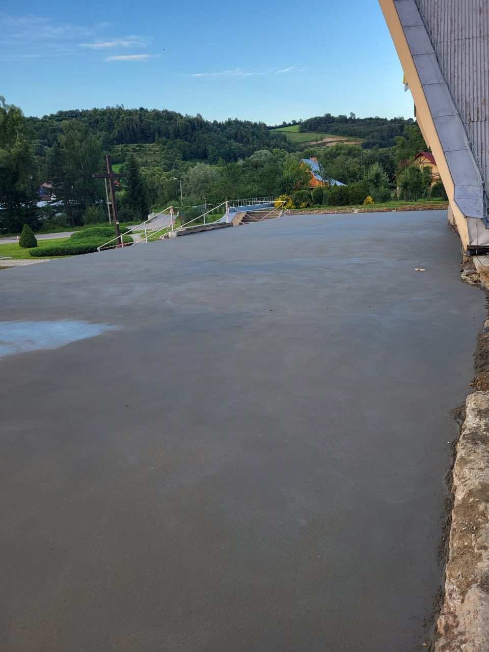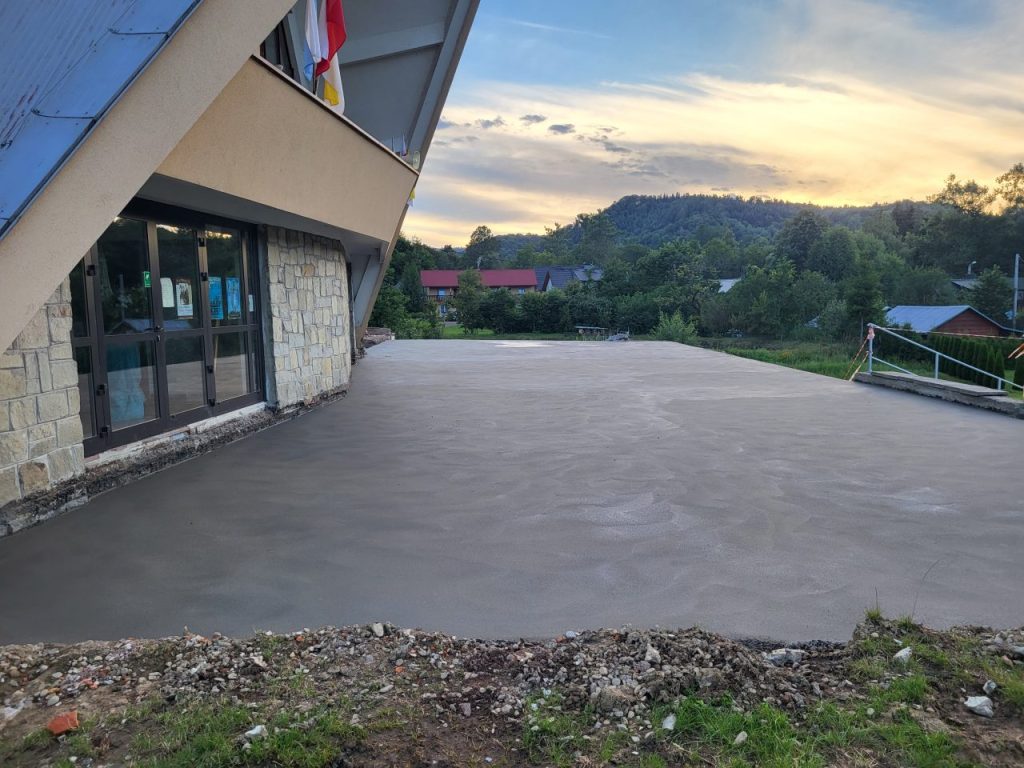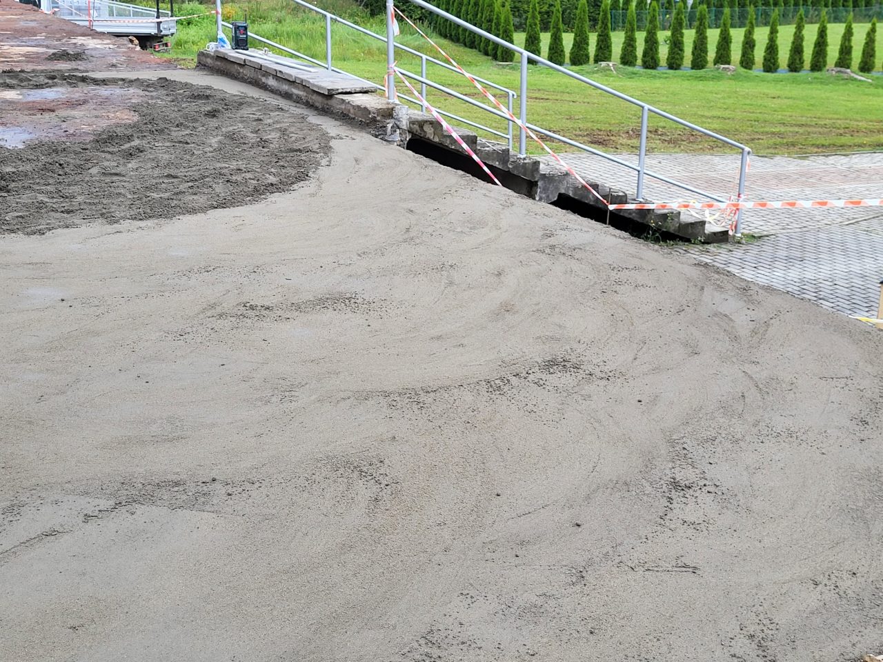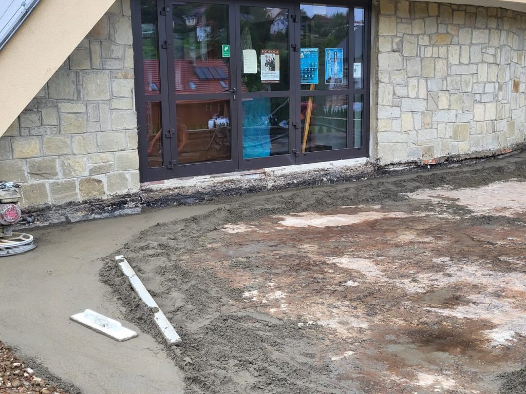 W ubiegłym tygodniu po oczyszczeniu tarasu została wykonana pierwsza wylewka. Wywieziono większość gruzu. Pozostały do rozebrania boczne schody.
