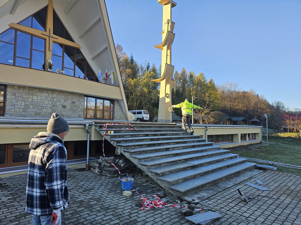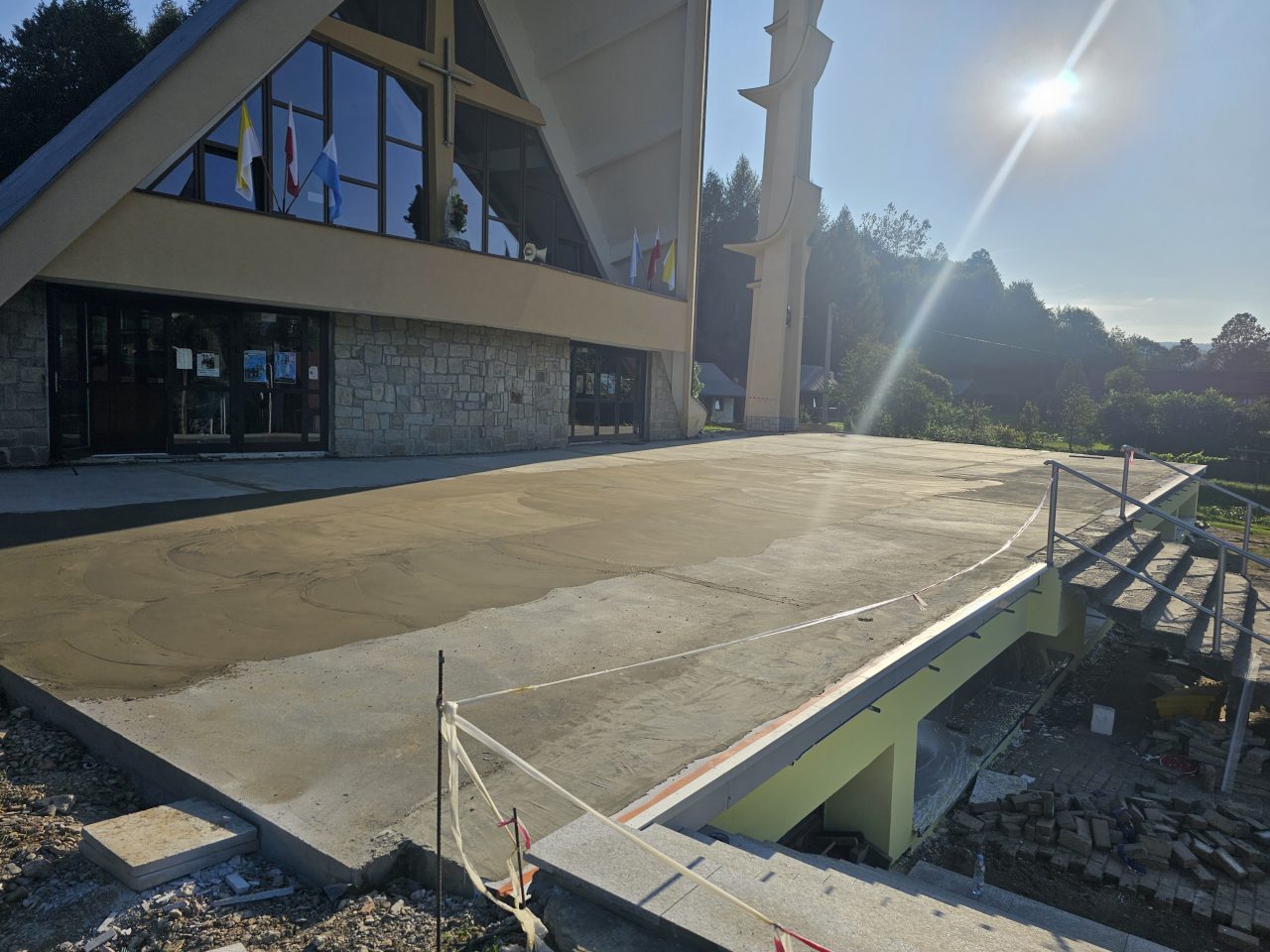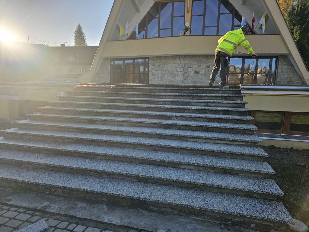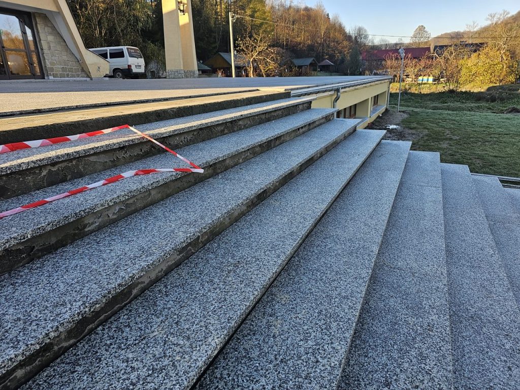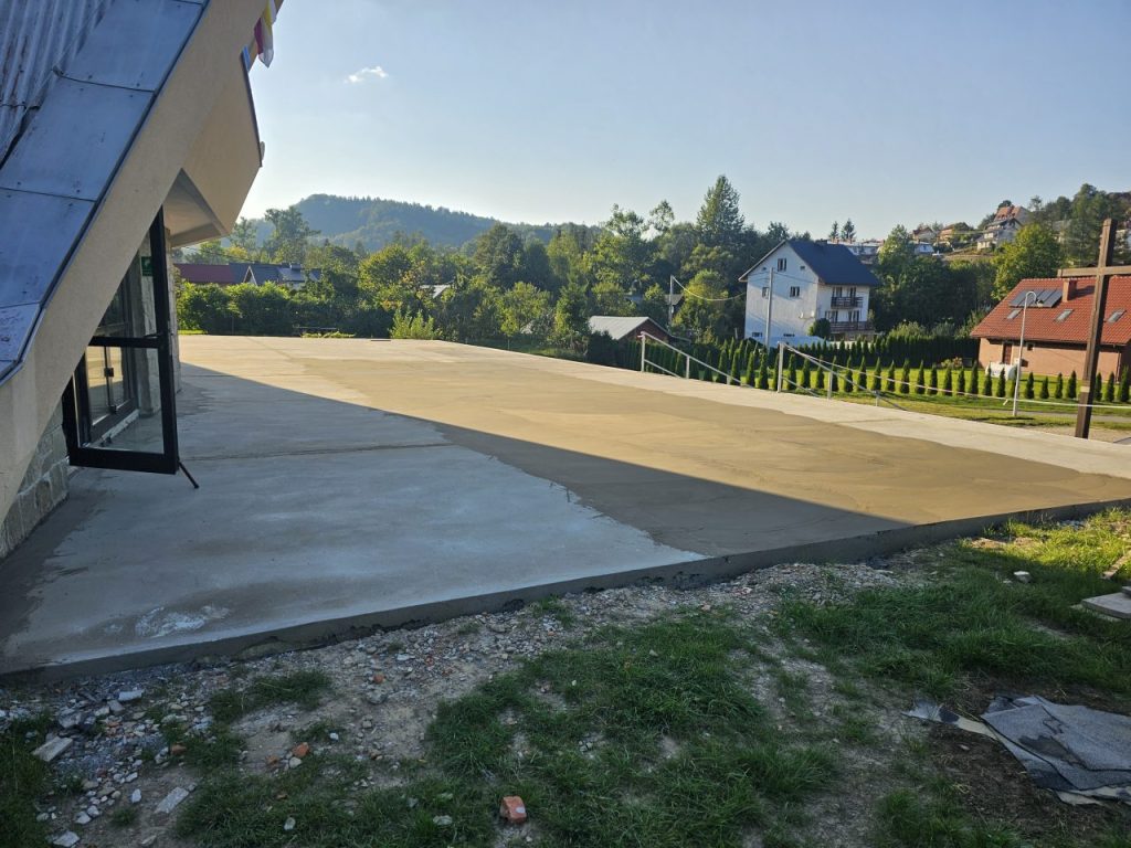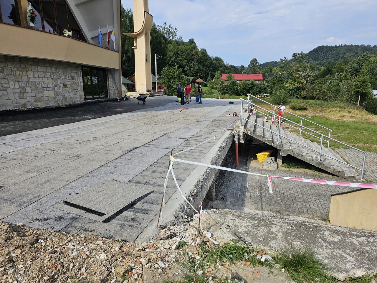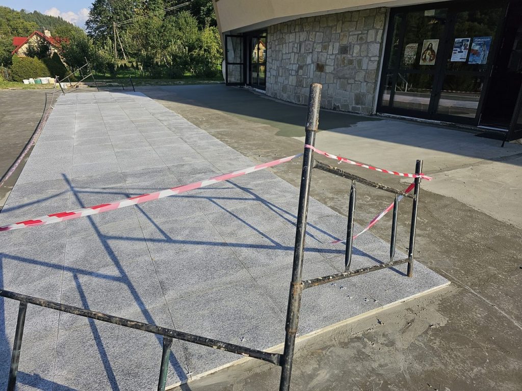 Zgodnie z zapowiedzią od połowy lipca zostały podjęte prace remontowe przy tarasie i głównych schodach do naszej świątyni. Ponieważ taras i główne schody są odsłonięte, a przez to są poddane na działania atmosferyczne: wody deszczowej, słońca, mrozu, co sprawiło, że wiele elementów straciło swoją trwałą przyczepność z podłożem, stwarzając niebezpieczeństwo podczas chodzenia. Dodatkowo powodowały nieestetyczny wizerunek głównego wejścia do naszej świątyni. Taki stan rzeczy wymagał podjęcia przed zimą koniecznego remontu. Dokonano najpierw demontażu zniszczonej odkrytej części schodów i murów bocznych co pokazało bardzo zły stan schodów i murów w swojej strukturze betonowej, która była już bardzo mocno skruszała i równocześnie mocno zawilgocona. Dokonano skucia zniszczonego materiału do trwałych powierzchni, uzupełnienia nową substancją do odtworzenia pełnej formy wszystkich elementów. Została wykonana izolacja przeciwwilgociowa dla odcięcia wilgoci z gruntu oraz hydroizolacja z zastosowaniem odpowiednich preparatów.